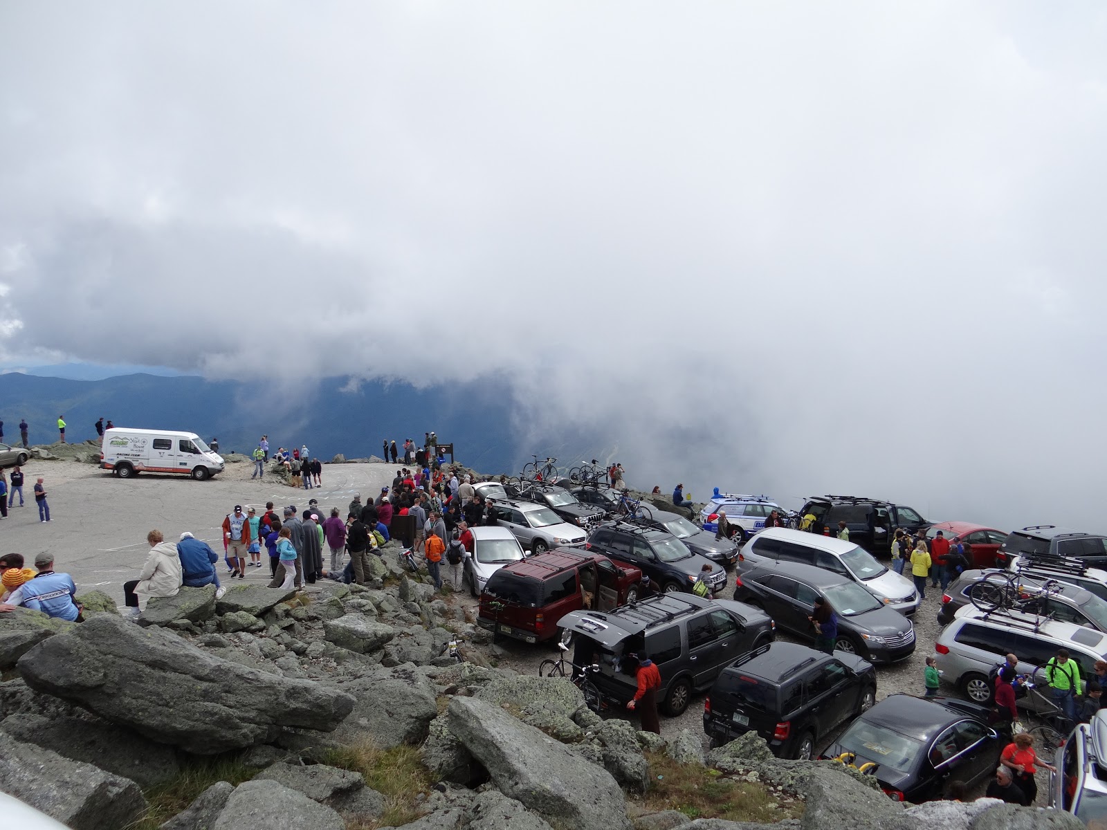 The weather on Mt. Washington, which is known to have some of the worst on earth and boasts the strongest wind gust ever recorded on earth at 231 miles an hour, was really quite pleasant while we were there. Note the chains over the roof of the building at the finish line. The announcer even commented on the remarkable lack of wind. There were some clouds that rolled in once in a while totally obscuring the buildings and just about everything else. The famous cog railway comes up there too, but we didn't ride it. After the race everyone had a great big turkey dinner in a large tent set up at the base of the mountain.